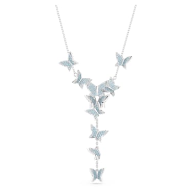 Bring a touch of fluttering beauty to your wardrobe with this delicate Y-shaped necklace. Crafted with rhodium plating, the design features small butterflies adorned with shimmering blue pavé. Wear this versatile piece with your everyday casual outfits, or to embellish your most elegant looks. Article no.:5662179 Collection: Idyllia Length (minimum – maximum): 14 7/8 –…