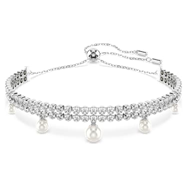 Discover a pure expression of elegance in this refined bracelet. Easily adjustable with a sliding ball closure, the rhodium plated design features two rows of cupchain, set with clear Zirconia in round cuts. An adornment of Crystal Pearls is then added below for a sensational look of luxury. Pair this bracelet with the matching choker…