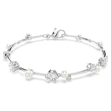 Embrace the infinite magic of the stars with this glittering Constella bangle. The inspired design features a delicate chain and a cluster of different-sized Zirconia and Crystal Pearls, which appear to float among the jewelry’s metallic bars. A pulling mechanism closure also enhances the fit, making it perfect for any wrist. Style this with other…