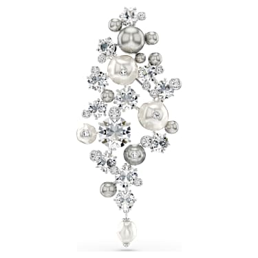 Embrace the cosmic side of your style with this starlike brooch in rhodium plating. The dramatic silhouette reveals a cluster of clear crystals and white and gray Swarvoski Crystal Pearls, meticulously brought together in a style that is complex yet harmonious. Wear this brooch alongside the matching earrings or choker to maximize the stellar effect….