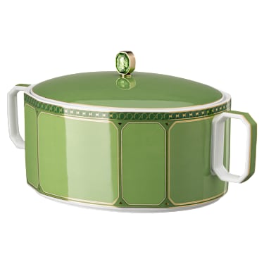 Create theatre at the table with this vibrant green serving bowl, designed in collaboration with porcelain brand Rosenthal. Featuring artful octagonal handles and a swan-engraved octagon-cut crystal on the lid, this is a special centerpiece for coming together and making memories. The bowl is dishwasher safe, however the lid should be hand cleaned. Usage in…