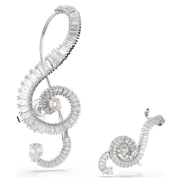 These asymmetrical music-inspired clip earrings will inject any outfit with rhythm and light. Taking the form of a treble clef in two different sizes, each rhodium plated piece is elegantly tapered and set with baguette-cut Zirconia. For an extra dose of pure star power, a single Crystal Pearl is then placed at the center. Gift…