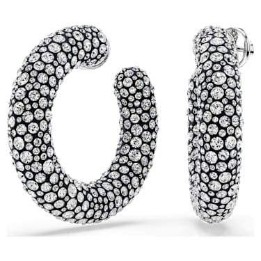These large Sublima earrings have a light-filled twist on the classic hoop style. Each rhodium plated piece features a stunning decoration of clear crystals, set in place using the Pointiage® technique. Wear them as your own glamorous accessory or give them as a wondrous gift. Article no.:5732283 Collection: Sublima Size: 1 5/8 x 3/8 x…