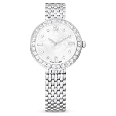 This Matrix watch is creatively crafted to accentuate any outfit. The round 30mm case is made in stainless steel and features a bezel set with a pavé of 30 crystals. Beneath the mineral glass, a mesmerizing guilloché dial is revealed, with the swan logo at 12 o’clock, along with indexes created from round and baguette…