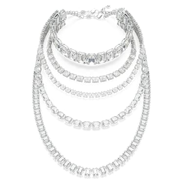 This statement necklace is a sublime example of finest savoir-faire. The rhodium plated design features five rows of clear crystals, all presented in a bold variety of shapes and sizes. It can be separated into two sets, with a choker and single necklace, or three longer necklaces on their own. Any way you wear it,…