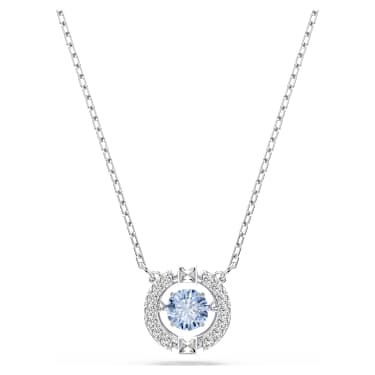 This timeless necklace is inspired by the idea of a ‘dancing crystal’, and features a round blue stone inside a 3D cage enhanced with crystal pavé. An essential addition to any jewelry box, it will give your daytime style a playful sparkle. The necklace is rhodium-plated. Article no.:5279425 Length: 14 7/8 inches Material: Crystals,Rhodium plated,Zirconia…