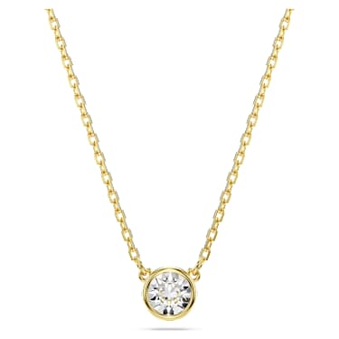 Embrace an effortlessly elegant look with this radiant Imber pendant. Worn on a delicate chain with a lobster closure, the gold-tone plated design features a central round crystal in a puffy bezel setting. A single Zirconia is also placed in the elongation for added luxury. Wear this piece to perfect refined style. Article no.:5684511 Collection:…