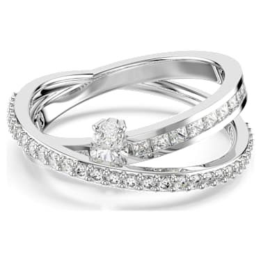 This twisting Hyperbola ring integrates multiple styles in one beautifully compact design. Its two overlapping rhodium plated bands are adorned with clear Zirconia in channel and prong settings. An additional oval-cut crystal is placed in between for added impact. Pair with a matching bangle for a truly showstopping look. Article no.:5691228 Collection: Hyperbola Material: Rhodium…