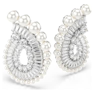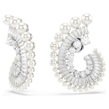 Infused with savoir-faire, these striking pierced earrings are an ultra-modern way to elevate any outfit. Each rhodium plated piece features an open spiral of round and baguette-cut Zirconia in a gradient of sizes. On the outer section, the design is completed by a gradient of Crystal Pearls, which deliver a luxurious and captivating touch. A bright and beautiful pair of earrings that can be easily matched with other pieces from the same creative family.