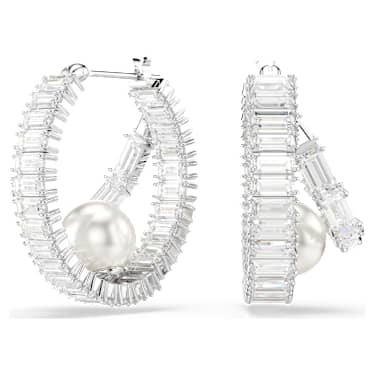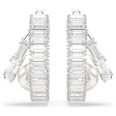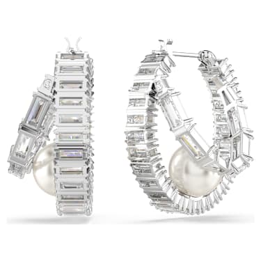 Embrace a modern twist on the classic hoop style. Each of these bright pierced earrings is rhodium plated and set with a full surround of baguette-cut Zirconia. A single Crystal Pearl is then placed at the base of each hoop to take the look to the next level of luxury. Pair these earrings with other pieces of matching jewelry to create your own expressive combinations.