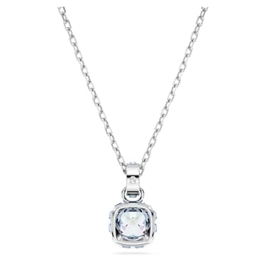 This delicate pendant is inspired by the birthstone of March. Hanging from a fine chain with a shimmering link of crystals, the rhodium plated jewelry features a single square-cut stone in a blue aquamarine hue, representing serenity and peacefulness. This meaningful design makes a magical birthday gift or can be worn to celebrate a time that is significant to you.