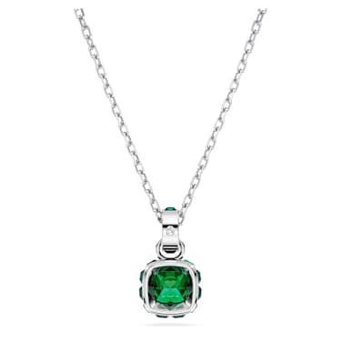 This delicate pendant is inspired by the birthstone of May. Hanging from a fine chain with a shimmering link of crystals, the rhodium plated jewelry features a single square-cut stone in an emerald green hue, a nature-inspired color that evokes rebirth and renewal. This meaningful design makes a magical birthday gift or can be worn to celebrate a time that is significant to you.