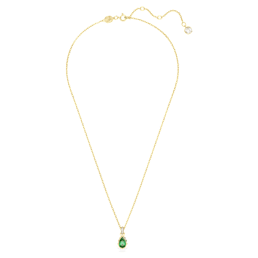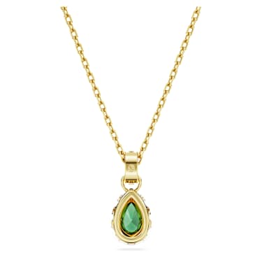 This shimmering pendant from the Chroma family is small yet powerfully beautiful. Like a droplet of light, the pendant features a pear-cut green centerstone in a gold-tone plated surround enhanced with square clear crystals around the edges and the bail. Beautifully attached to a gold-tone plated chain with a round stone detail at the end and a 5cm elongation, this is a piece you can wear every day, making it a signature part of your style.