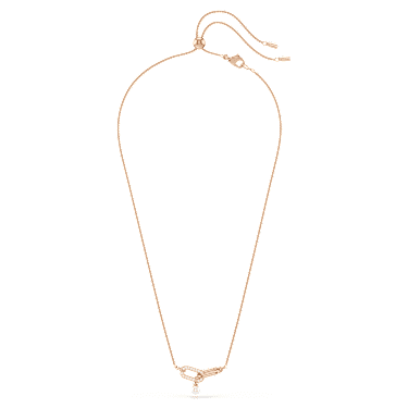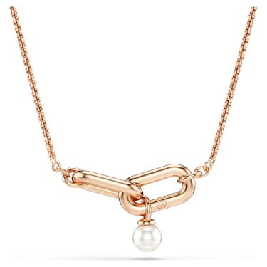 Express pure elegance with this rose gold-tone plated pendant. Suspended from a delicate chain, the central motif features two interconnecting links, with one adorned in clear pavé, and with a single Crystal Pearl that hangs beneath. Completed with a lobster closure, this pendant also includes a pulling mechanism for an adjustable fit. For a harmonized look, pair it with matching earrings or a bracelet from the same family.