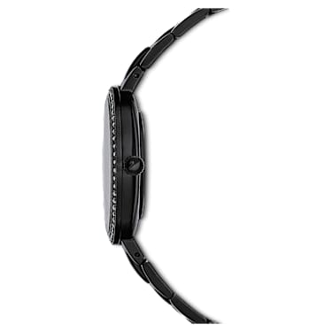 Smart, sleek, casual: This watch features on-trend design embellished with sparkling crystals. Rose-gold tone plated index markers contrast attractively with the black-tone PVD coated stainless steel case and bracelet and the glittering black dial. The bezel is set with shimmering pavé, adding a hint of glamour. A great look for any occasion, this Swiss Made watch is ideal for casual yet fashionable outfits.