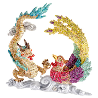 Bringing two auspicious characters together for the Year of the Dragon, this captivating decoration is vibrant and meaningful. Each piece has taken 308 hours to complete, with approximately 30,500 crystals delicately set by hand. The design is shaped in a full circle, symbolizing harmony and completion, and is enhanced with splashing waves at the base and dramatic clouds around the dragon’s tail. A gold-tone crystal ball is also added to the dragon’s claw to add further exquisite detail. This incredible home décor piece is set on a Ceralun base and is limited to 150 pieces. Dimensions: H 225mm, L 240mm, W 105mm. Decoration object. Not a toy. Not suitable for children under 15.