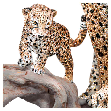 A majestic family of cheetahs takes center stage in this powerful and thought-provoking sculpture, which takes 324 hours to complete. Fashioned with more than 53,000 crystals, it is an exquisite example of our Pointiage® technique, displaying the skill and precision of our master craftspeople. The animals feature their typical tear-shaped stripes from eyes to mouth and spotted fur that is exceptionally detailed. The name Mirembe means “peace and quiet”, a perfect representation of this tranquil scene with a mother cheetah and her two young cubs. This creation will enhance any home as a testament to the uniqueness and beauty of these animals, as well as the importance of protecting their delicate habitat. This piece is only available in a limited worldwide number of 200. Decoration object. Not a toy. Not suitable for children under 15.