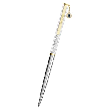This slender ballpoint pen offers a timeless accessory for endless creativity. The slimline design is filled with around 400 clear crystals, which are visible through the long transparent window. A mix of gold-tone and chrome finishing is used for an ultra-luxurious look, while the evil eye charm adds a mysterious and meaningful touch. Gift to yourself or someone you know who has a poetic way with words. Refills of black and blue inks are available to purchase in stores.