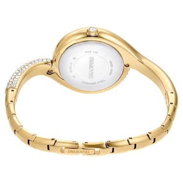 This captivating Dextera watch takes its cues from the classical timepieces of a vintage era. The 29mm stainless steel design is gold-tone finished and creatively embellished with a pavé of clear crystals over half the bezel, as well as half the bracelet. The minimalist dial features a sunray effect and is accented only with three crystal hour markers and a swan logo at 12 o’clock. A total of 203 crystals are used in the creation of this timepiece, including the single crystal that is placed within the crown. This Swiss made watch is water resistant to 50 meters and is a pure expression of sophistication.