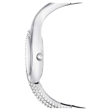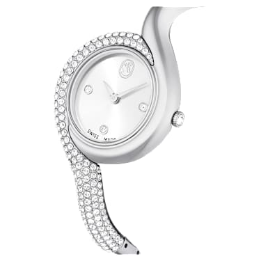 This captivating Dextera watch takes its cues from the classical timepieces of a vintage era. The 29mm stainless steel design is creatively embellished with a pavé of clear crystals over half the bezel, as well as half the bracelet. The minimalist dial features a sunray effect and is accented only with three crystal hour markers and a swan logo at 12 o’clock. A total of 203 crystals are used in the creation of this timepiece, including the single crystal that is placed within the crown. This Swiss made watch is water resistant to 50 meters and is a pure expression of sophistication.