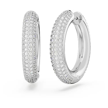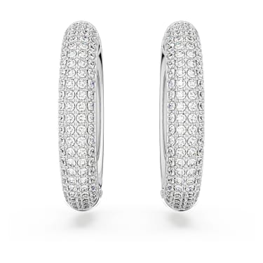 These industrial-chic earrings are designed for a statement look. Showcasing our iconic pavé technique, each circular rhodium plated hoop is embellished all-over with shimmering clear crystals. Pair these earrings with other pieces from the Dextera family and take your bold metallic styling to the max.