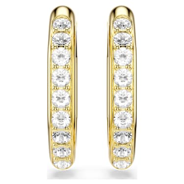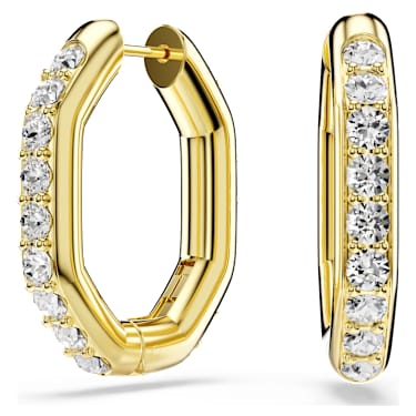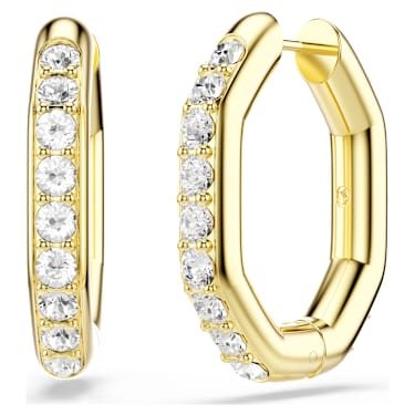Make an expressive statement with these geometric hoop earrings. Their slender octagonal design creates a bold frame for the single row of clear round-cut crystals, which are each placed in a delicate prong setting. A special spring plate mechanism makes these earrings easy to open and close, while the gold-tone plating is perfect to mix and match with other Dextera pieces.