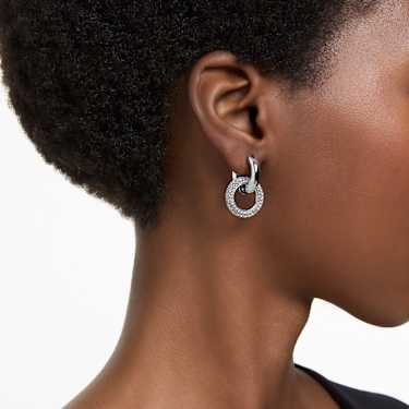 These Dextera interlinked hoops feature two rhodium plated tubular rings, one with all-over pavé. To add an asymmetrical touch, the positioning of the rings is different on each piece, and for added versatility you can detach the second hoop for a single hoop style.
