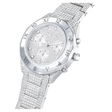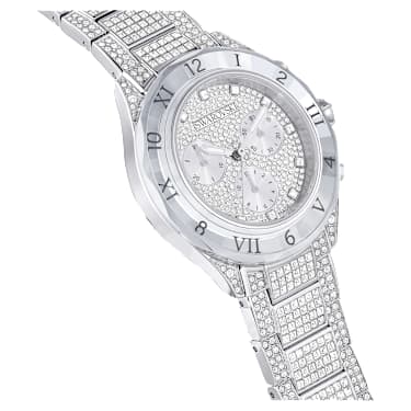 A truly dazzling ode to savoir-faire, this iced-out Dextera timepiece radiates brilliance every hour. The 40mm stainless steel case is mounted with a crystallized bezel, cut to reflect the light. Most strikingly, the chronograph dial is embellished with 240 round-cut crystals and three subdials including a minutes counter, seconds counter, and hours counter. For maximum shine, the index markers are indicated with individual crystals and the hands are coated in bright Luminova. The case itself is encrusted with 40 crystals, with a single crystal set in the crown, and a total of 492 crystals adorn the stainless steel bracelet. This Swiss made watch is water resistant to 50 meters and exudes joyful extravagance.