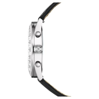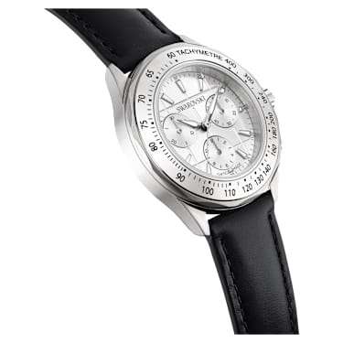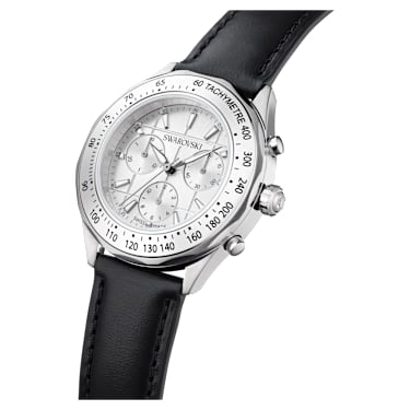 Expressing precision through sophistication, this Dextera chronograph is a bold and sporty choice within timepiece collection. The 40 mm stainless steel case is seamlessly integrated with a metallic bezel that is printed with a black tachymeter scale, traditionally used to measure speed over distance. This provides a frame for the silver-tone sunray dial, which is displayed with a modern grid pattern, fluorescent hands and indexes, and three subdials, including a minutes counter, seconds counter, and hours counter. Around the wrist, this Swiss Made watch is worn on a black leather strap and includes a single crystal in the crown, as well as a water resistance of 50 m.