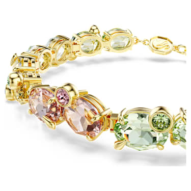 With a scintillating collision of colors, this bright Gema bracelet is perfect for playful self-expression. The gold-tone plated design features a row of large crystals in multiple vibrant hues, surrounded by smaller crystals in a joyful bubble prong setting. The expert faceting and vivid color combinations will instantly boost the energy and light within your style. Pair it with a matching pendant to boldly elevate any outfit.