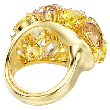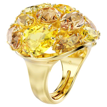 This joyful Gema cocktail ring is like holding a ray of sunshine in your hands. The gold-tone plated design is crafted with a collision of crystals in various cuts and yellow and amber tones, while also featuring an adjustable mechanism for the perfect fit. This ring is emblematic of Gema’s unexpected formations and vibrant beauty, and glows even brighter when worn alongside matching jewelry pieces from the same family.