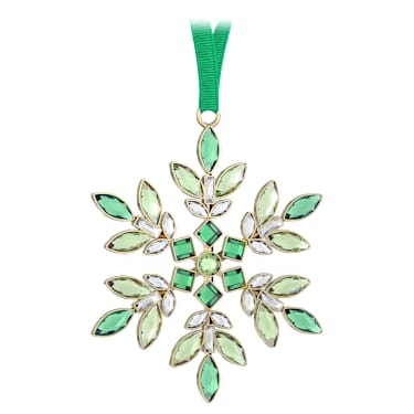 Inspired by the vibrant Gema family, this collection of radiant snowflake ornaments is presented in brand colors with a nod to the holiday season. This green piece is formed from 86 individual crystals in a variety of cuts and shades, applied on both sides using jewelry stone setting techniques. The design is suspended from a green grosgrain ribbon and is completed with a glossy gold-tone finish. Collect all four of the Gema snowflake ornaments to create a joyful multicolored display in your home. Decoration object. Not a toy. Not suitable for children under 15.