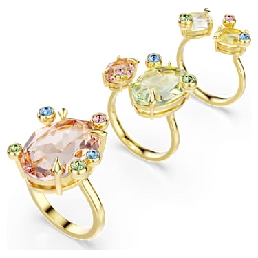 Embrace the abundance of crystals in this energizing jewelry set. The unexpected combination includes two open bands and one closed ring, each decorated with large crystals in multiple hues and smaller crystals in a joyful bubble prong setting. Worn together, this glowing set makes a bold color statement that will brighten your style, as well as your entire day.