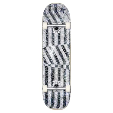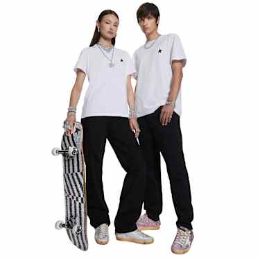 With its unique mix of crystals, graphic lines, and skate-scene style, this extraordinary Golden Goose skateboard from Creators Lab is a collectible art piece. The deck features a sleek top side with a crystallized band displaying the and Golden Goose wordmarks. On the underside, the distinctive Golden Goose Flag is fully-drenched in black, white, and gray Crystals in a dynamic design that channels the freedom of expression found in the skateboarding world. This original skateboard is part of Creators Lab and is exclusively available from.com or in select stores. The skateboard is a showpiece and is not designed for use.