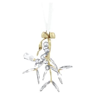 This luxurious ornament is the perfect excuse to share a festive kiss. Suspended from a white grosgrain ribbon, the traditional mistletoe is crafted in glossy champagne gold-tone metal, with radiant clear crystals used for the leaves and berries. With a total of 1,104 facets, the design will create endless light reflections across your holiday décor. Hang it somewhere prominent to celebrate the joy of the season. Decoration object. Not a toy. Not suitable for children under 15.