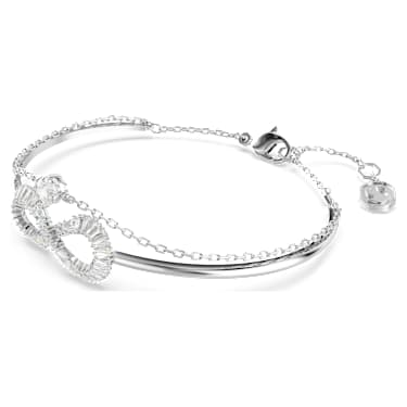 Infused with delicate beauty and symbolism, this Hyperbola bangle can be worn time and time again. The rhodium-plated design features a rigid band with an infinity motif, which is adorned with clear Zirconia. A second chain has also been added, with a single round Zirconia set at the center. A stunning double-wrapped bangle that will effortlessly carry you from day to night.