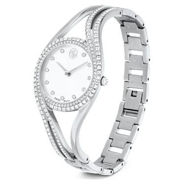 Distinguished by elegant curves and a sense of refinement, this Hyperbola bangle watch blurs the line between jewelry and timepiece. The 28mm stainless steel case features a combined bezel and bracelet set with 176 clear crystals in princess and round cuts. The sunray dial also displays 11 hour markers made with crystals, along with a Swan logo at 12 o’clock. For a beautiful finishing touch, this Swiss Made watch includes a single crystal set within the crown, while offering a water resistance of 50m. It’s a modern timepiece choice that combines artistry with impeccable savoir-faire.