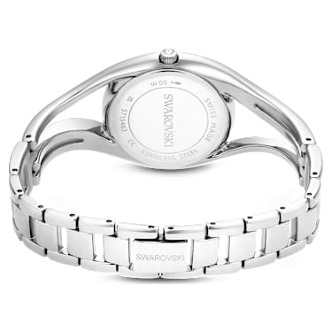 Distinguished by elegant curves and a sense of refinement, this Hyperbola bangle watch blurs the line between jewelry and timepiece. The 28mm stainless steel case features a combined bezel and bracelet set with 176 clear and blue crystals in princess and round cuts. The sunray dial also displays 11 hour markers made with crystals, along with a Swan logo at 12 o’clock. For a beautiful finishing touch, this Swiss Made watch includes a single crystal set within the crown, while offering a water resistance of 50m. It’s a modern timepiece choice that combines artistry with impeccable savoir-faire.
