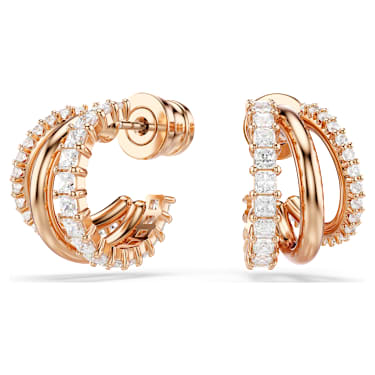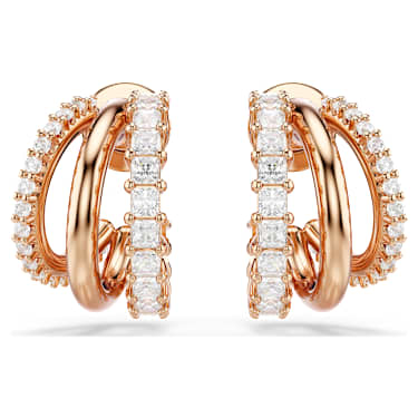 These intricately crafted Hyperbola earrings showcase a unique beauty. On each side, the three mini hoops are presented in rose gold-tone plating, adorned with round- and square-cut Zirconia in a prong setting. Style with a matching bangle or necklace for a showstopping look.