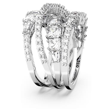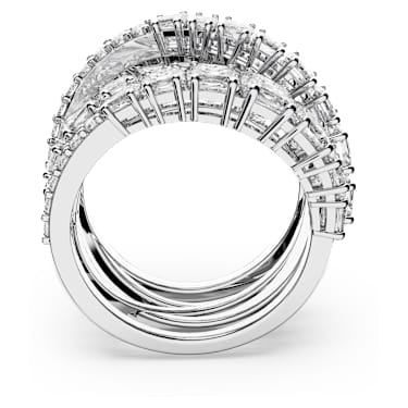 Intricate and opulent, this marvelous ring reinterprets the spiral trend magnificently. Gently curving lines of white stones of various sizes in round, square, and tapered baguette-shapes sparkle brilliantly in many facets. Complemented by a shimmering finish, the elegant design makes it perfect for dressing up your style, adding a radiant touch of glamor to your look.