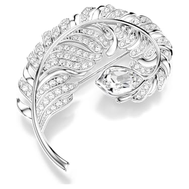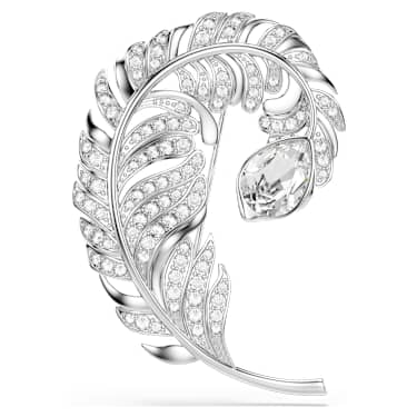 Crafted with exceptional attention-to-detail, this Idyllia brooch captures the delicacy and lightness of a feather. The rhodium plated design is embellished with clear pavé and is accented with a single clear crystal in a pear shape. Wear it to celebrate nature alongside a matching pendant or bracelet.