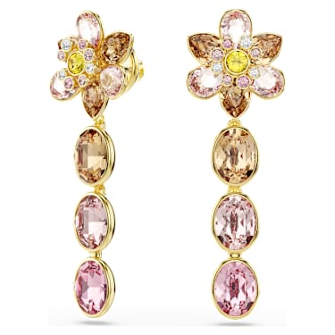 Designed to make a statement, these gold-tone plated earrings are a symphony of color and light. Each piece reveals a flower made from crystals in various cuts and colors, and then features a drop of three bezel-set crystals in the same soft tones. This nature-inspired pair is ideal for everyday styling and matches beautifully with other jewelry choices from the Idyllia family.