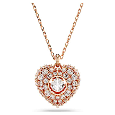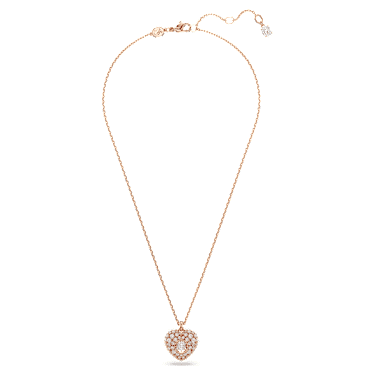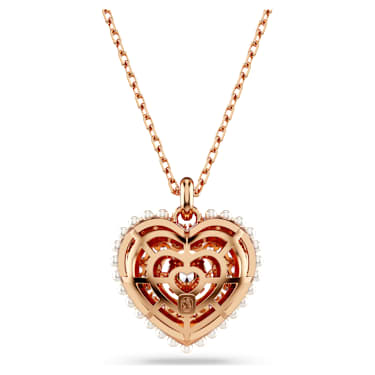 This adorable heart pendant is the perfect display of exquisite savoir-faire. The rose gold-tone plated motif has been created with a cage design for maximum volume, with tiny white Crystal Pearls around the edges. To enhance the domed effect, the heart is adorned with clear Zirconia, set in place using the dazzling chatonnage technique, while at the center, a round dancing Zirconia catches the light from every angle. A romantic way to add warmth and light to your style.