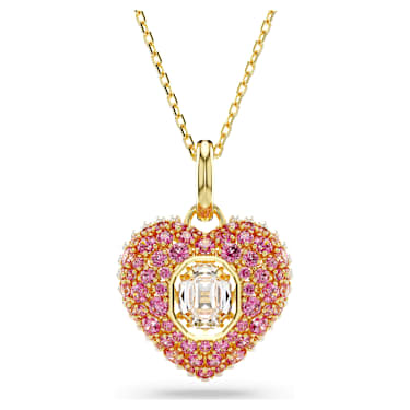 Let your heart be captured by this striking pendant. The gold-tone plated motif has been created with a cage design for maximum volume and features an array of tiny white Crystal Pearls around the edging. To enhance the domed effect, it is adorned with round pink Zirconia, set in place using the dazzling chatonnage technique, while at the center, an octagonal dancing stone catches the light from every angle. Gift this as a special surprise to someone you adore.