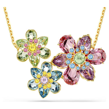 Showcasing a bright bouquet of three flowers, this stunning pendant will bring peace and nature into your style. Suspended from a gold-tone plated chain, the central motif is adorned in crystals of different shapes and colors, creating an overall effect of mood-boosting joy. A wondrous piece to wear on its own or paired with a matching Idyllia ring.
