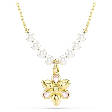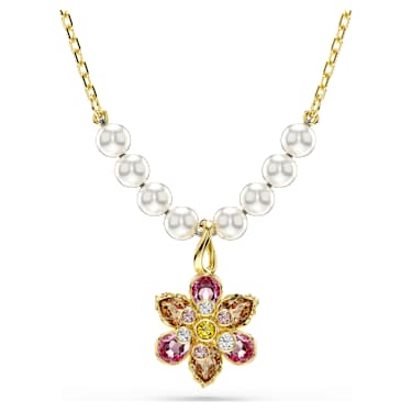 This charming pendant adds a magical and nature-filled touch to any outfit. The gold-tone plated chain features eight Swarvoski Crystal Pearls, elegantly set on either side of a single flower, which has been expertly crafted from crystals in various cuts and soft colors. The jewelry includes a lobster closure and an elongation for an adjustable fit. A wonderful gift of luxury for effortless everyday wear.