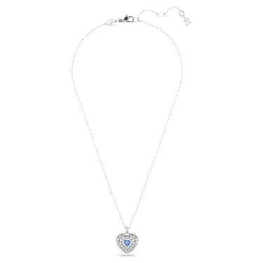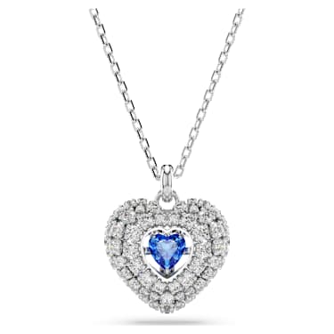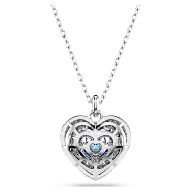 Two hearts become one in this romantic pendant. The rhodium-plated motif has been created with a cage design for maximum volume. To enhance the domed effect, it is adorned with round clear Zirconia, set in place using the dazzling chatonnage technique, while at the center, a heart-shaped dancing stone in blue catches the light from every angle. A perfect way to say ‘I love you’ to someone special.