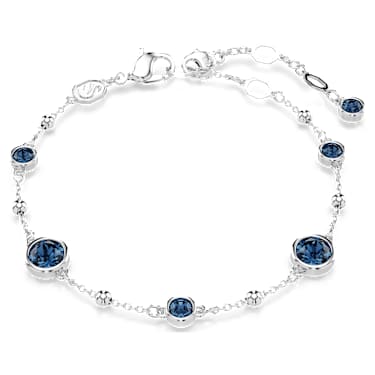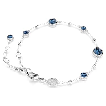 With its dynamic mix of shapes, this Imber bracelet will give your wrist a distinctive glow. The rhodium plated chain features a lobster closure and a strand of metal droplets, interspersed with round blue crystals in a refined bezel setting. The piece also includes an extra elongation, allowing it to fit all sizes. Perfect for adding a soft and graceful touch to an outfit.