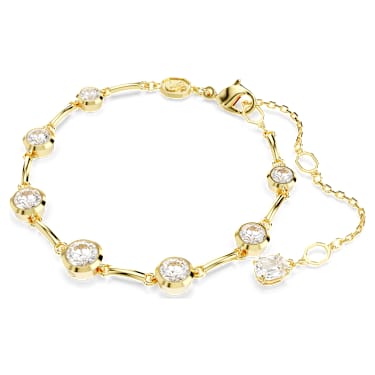 Simplicity reigns supreme in this elegant bracelet from the Imber family. The gold-tone plated design is embellished with seven Zirconia in round cuts, each placed in a modern bezel setting. For an adjustable fit, the lobster closure is accompanied by three size positions and a single Zirconia at the end of the extender. Wear this bracelet with a matching Imber necklace to maximize the look of refinement.