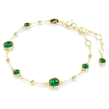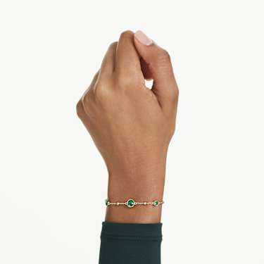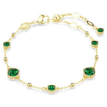 With its dynamic mix of shapes, this Imber bracelet will give your wrist a distinctive glow. The gold-tone plated chain features a lobster closure and a strand of metal droplets, interspersed with round green crystals in a refined bezel setting. The piece also includes an extra elongation, allowing it to fit all sizes. Perfect for adding a soft and graceful touch to an outfit.